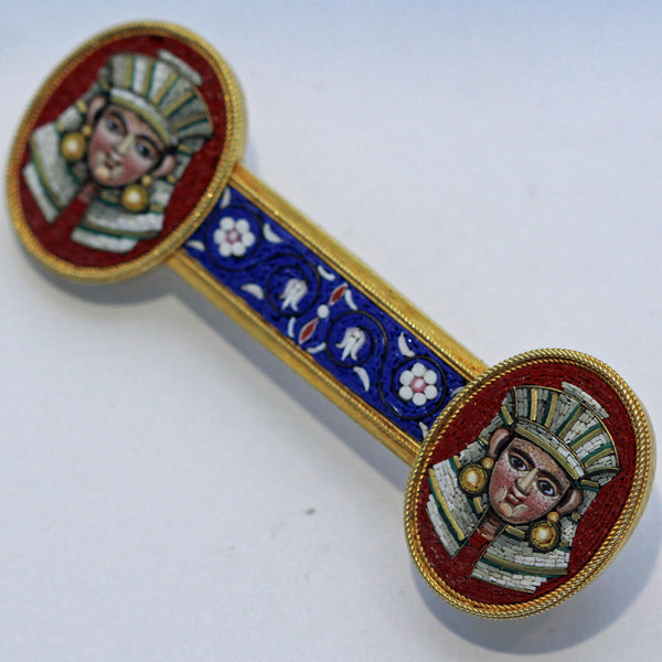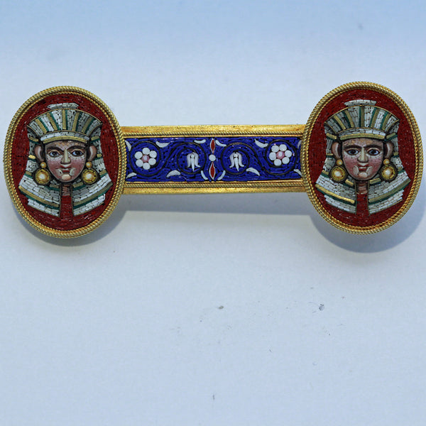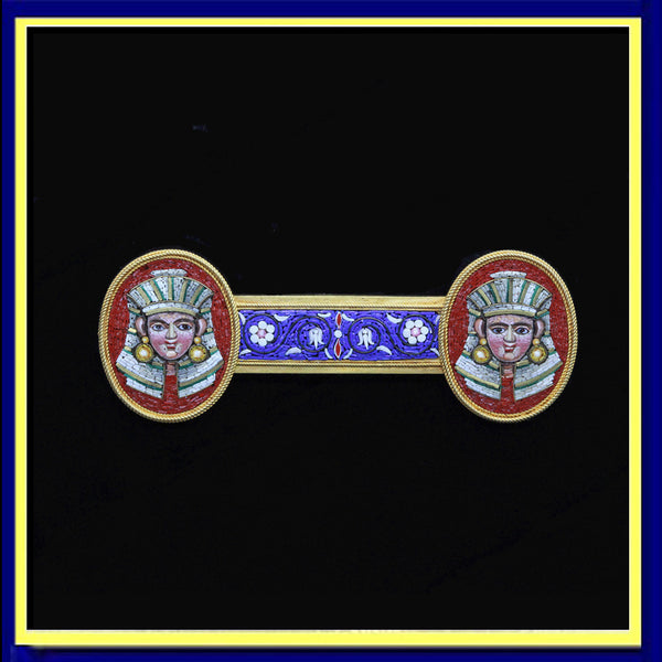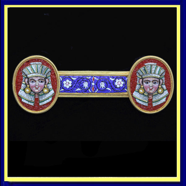 Description : Micromosaic brooch in the Archaeological Revival style reflecting Egyptomania during the 2nd half of the 19th century with the excavations of the Old World. The Victorians, like their later counterparts during the Art Deco period, were obsessed with Sphynxes, Pharoahs, lotus leaves and pyramids.