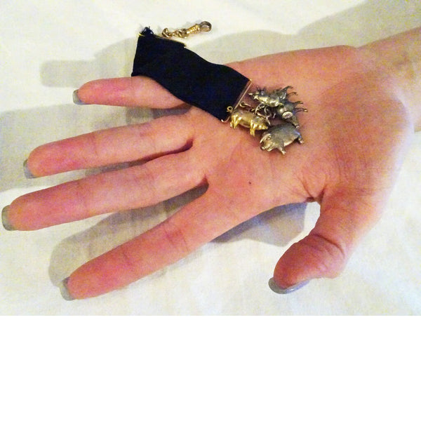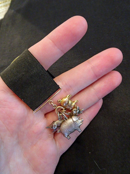 Description : Victorian black ribbon with the gilt metal fittings of a watch fob, including buckle, hanger and swivel lobster clasp on a short chain. The exciting part of this fob are the 4 little pig charms in silver and gold colored metal, the metal assumed to be of no significant intrinsic value. However, the pigs are a total delight. They range in size and surface texture treatment. Each is naturalistically formed in a different way. They are utterly charming (no pun intended) and come from a London gentleman's pig collector. Can be attached to a necklace or charm bracelet. Make the perfect gift for anyone, especially the man who has everything and wants something totally original and unique.