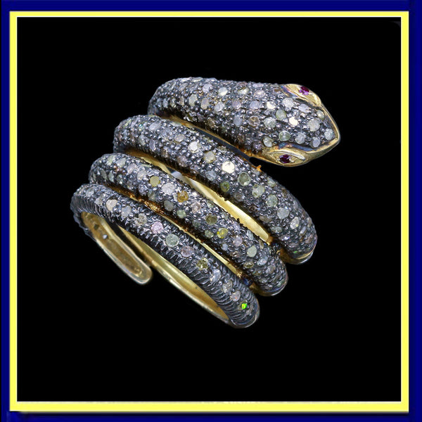 Particularly lovely example of a snake ring. 4 rings / coils, richly pave set with diamonds. Diamonds set in silver, layered on gold. The eyes are purple gems - too small to test. Looks great on the finger and an ideal ring for wearing both by day and night.
