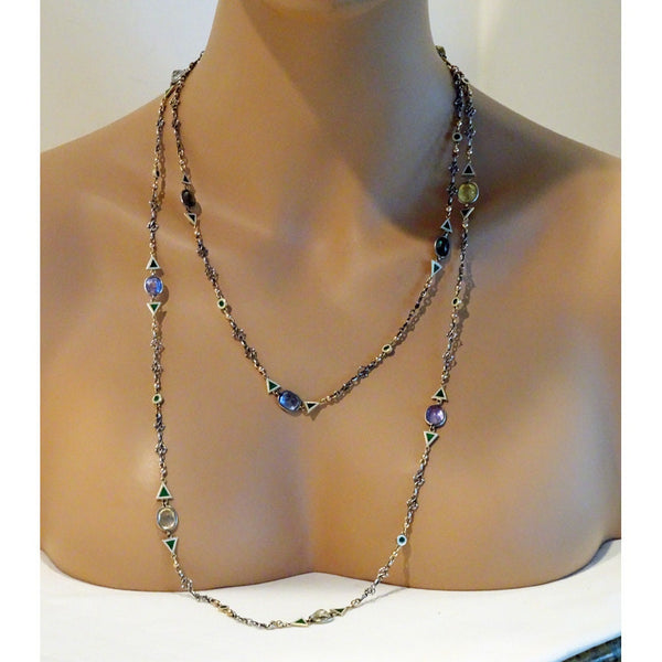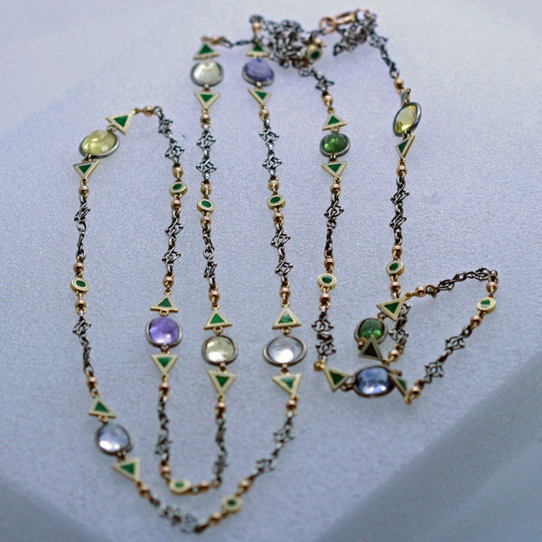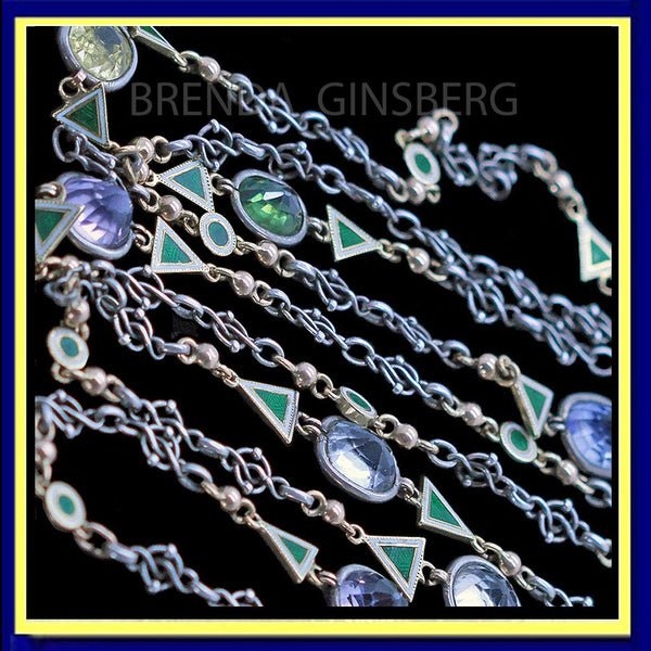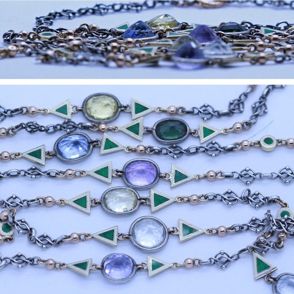 Description : Two very fine Arts and Crafts mixed metal chain necklaces. Composed of alternating sections of sapphires, enamelled gold stations, gold beads and links and further silver chains. The multi-coloured round-oval sapphires are spectacle set in silver. Each is linked via gold loops to mirror-image gold triangles, guilloche enamelled in green and white. Tiny crimped pattern on outer gold borders. Triangles are enamelled on both sides so the chains are fully reversible. The point of each trinagle is followed by more gold links with a golden bead in their center. This in turn, is followed by a wonderful silver section, composed of intertwining Celtic knots. The design influence of British Arts & Crafts is very clear and reminiscent of Archibald Knox who incorporated such Celtic features into their jewelry designs. The silver sections are followed by another gold section, exactly as the one described above, with a small, round enamelled disc following them. The circular gold disc is guilloche enamelled in green and white to match the triangles previously described and have the same fine pattern on the gold borders. This entire series is repeated throughout the necklaces.