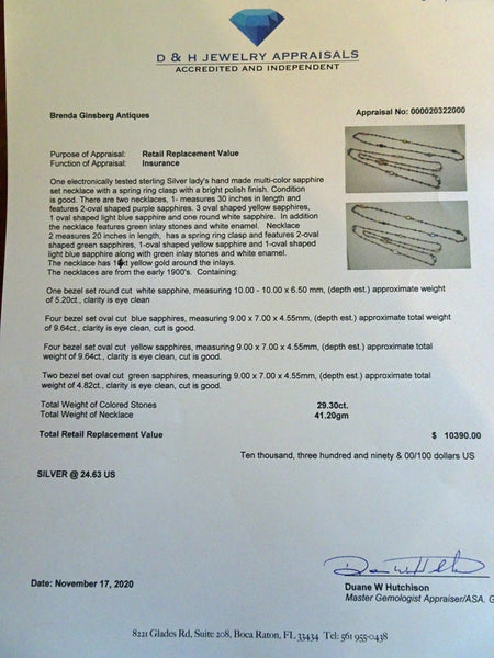 Measurements: Weight is 41.2 grams. Longer chain is approximately 32inches (83.5cm) long. Shorter chain is approximately 22 1/2 inches 57cm long. 29.30ct sapphires.