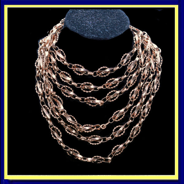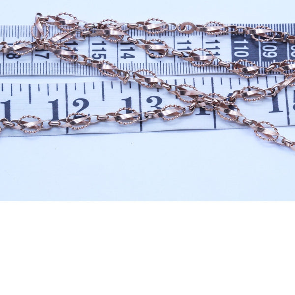 Description : Twisted elongated oval links with overlapping filigree circles of gold. Connected by small round gold loops. Gold has a distinct red tone, often used in Russia about 100 years ago and it is very possible that this chain was made in that country. The length of the chain makes it extremely versatile. It can be wound two or three times around the neck and it can be worn around the arms as well. Design combines a solidity with a lightness and gold ribbons have a wonderful glow that catches the light and gleams. Great for wearing with any outfit - from very smart to very casual.