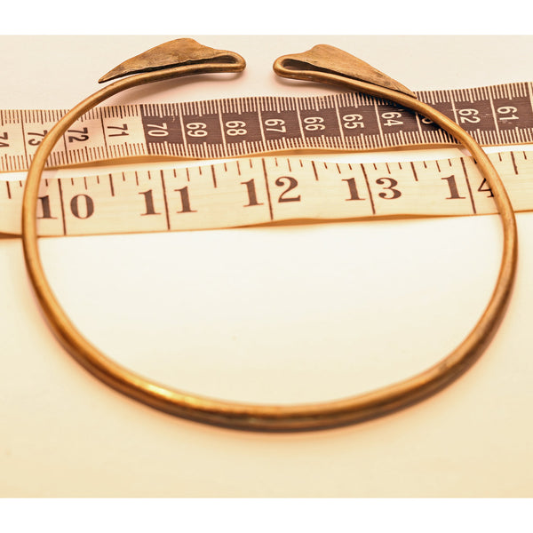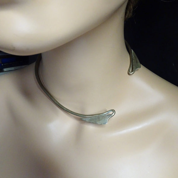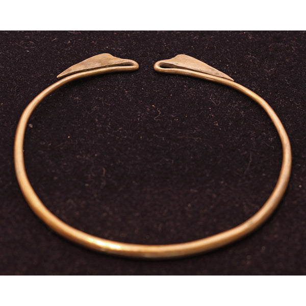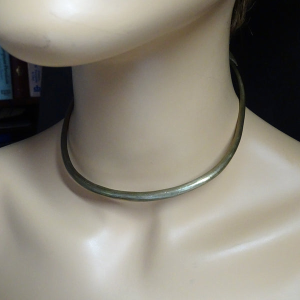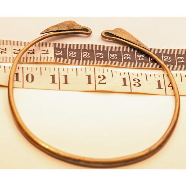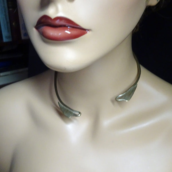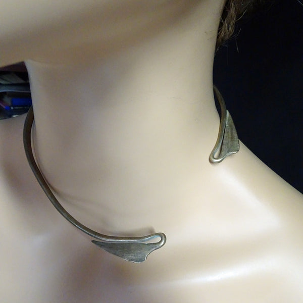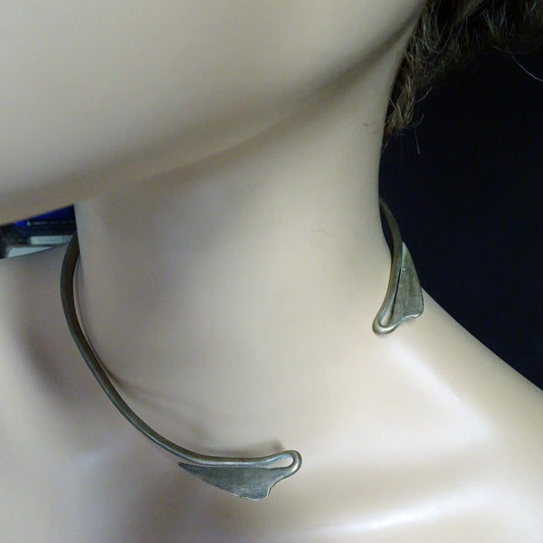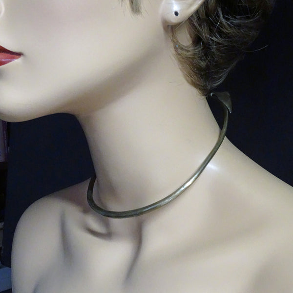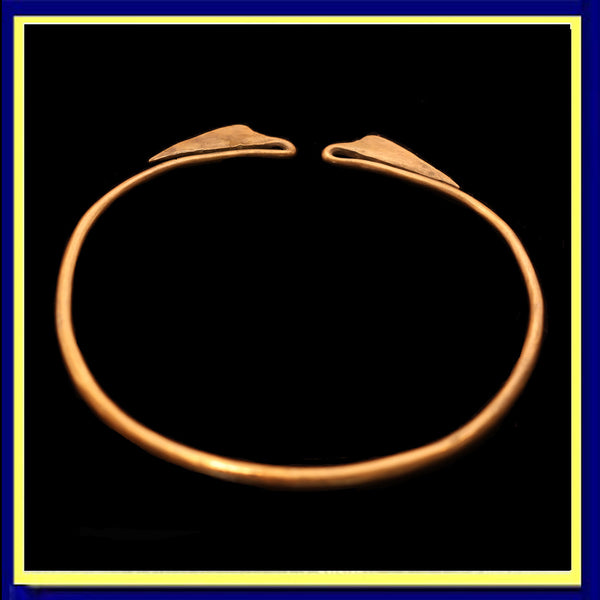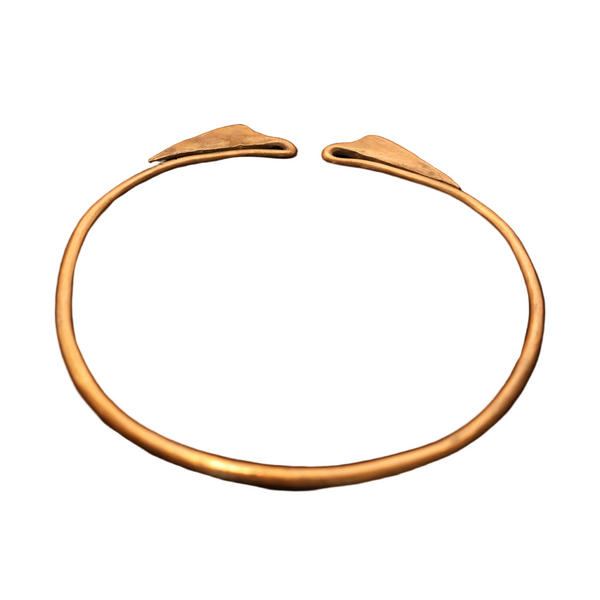 A torque (torc) or collar necklace made of copper mixed with some other metals. A sturdy, solid, cylindrical form that is subtly wider in front and tapering towards the opening at the ends. At the furthest ends, where the two sides meet the narrowest part of the band dips and loops back on itself, in the form of a gentle stem and elegant lotus leaf.
