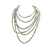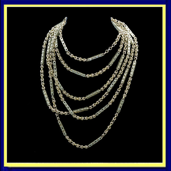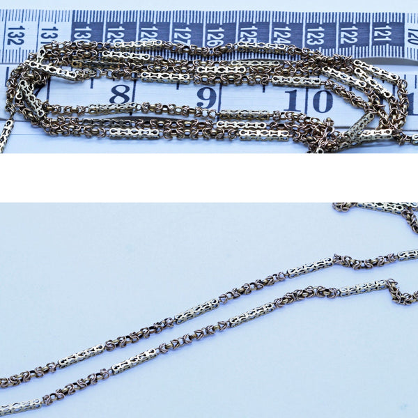 An extremely long, very solid gold chain that can be wound multiple times around the neck, arms or even as a belt around the waist. There are two alternating sections that make up the pattern: long, rectangular, box-like links with openwork in an escutcheon design. These alternate with sections composed of smaller individual links - some simple loops and some knotted wirework (like a reef knot about to be tied) for additional interest and variety. The pattern of the links adds dimentions of visual interest and strength to the chain. These chains are extremely versatile and can be worn many ways as well as with any outfit from jeans to elegant suits. Very well made. The jump loop (clasp) is not original to the chain and is silver.