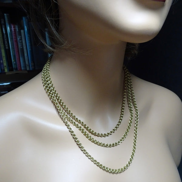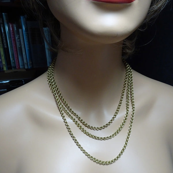 The Story: who owned this marvellous chain over 100 years ago? How did she wear it and with what outfits? How did it get to us? From the age, we know that generations of women have owned and enjoyed this versatile jewel. However, exactly because of its very versatility, we can't identify the original owner. We can assume that she was a lady of means because this quality and size of gold necklace was not available to most people. Was she given the chain for some kind of coming out event to mark her introduction into society? Did she celebrate an anniversary, wedding, engagement or birth of a child with this necklace? We are left wondering. Perhaps that makes it all the more exciting to be the next in line, owning, enjoying and taking care of this wonderful gold chain and then perhaps leaving a clue for the coming generations who will own it later. Who are we and who will they be?