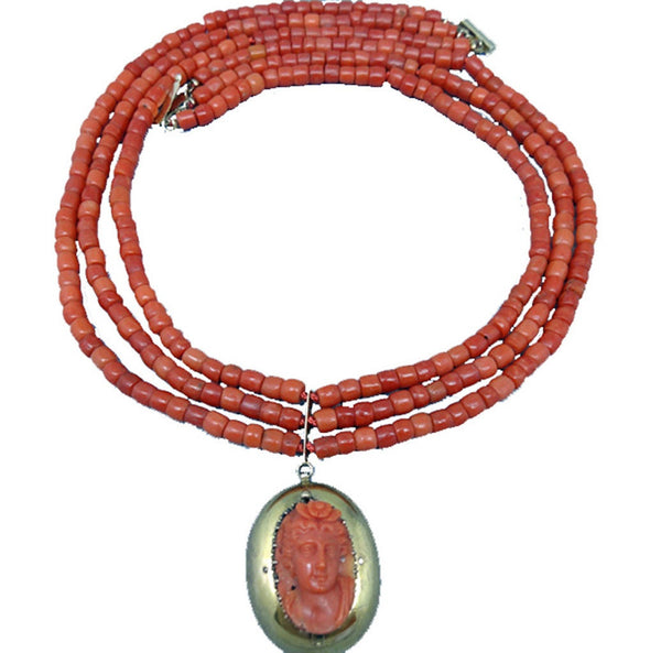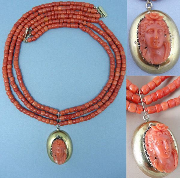 Antique Victorian Classic Revival 3-strand coral necklace with cameo pendant. 14k Gold and natural coral. Coral from Italy but cameo and necklace could be made in France or England. Made circa 1840-60.