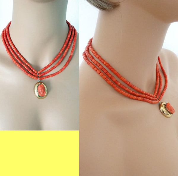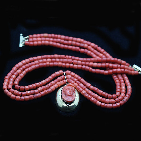 Coral of a beautiful deep orange color. 3 strands of beads are suspended from the gold bar clasp so that the bottom two drop en esclavage - in loops - below the top one. A gold clip in the center attached to loops, suspends a gold and coral carved cameo pendant. The gold arching around to show off the coral to better advantage. The coral is carved in the form of a beautiful woman of Classic style. She has flowers in her flowing, curly hair. She is very beautiful, classically proportioned and carved with very fine artistry. The whole makes a fabulous necklace.