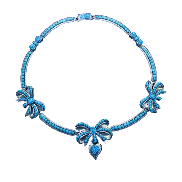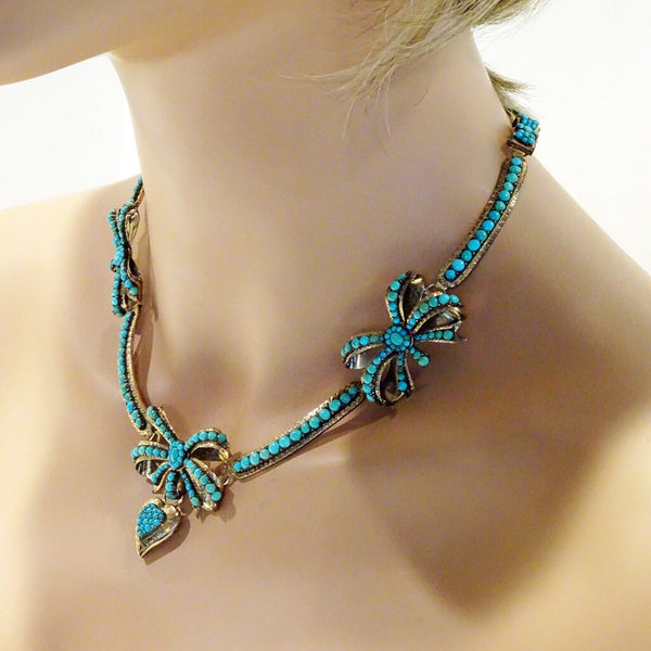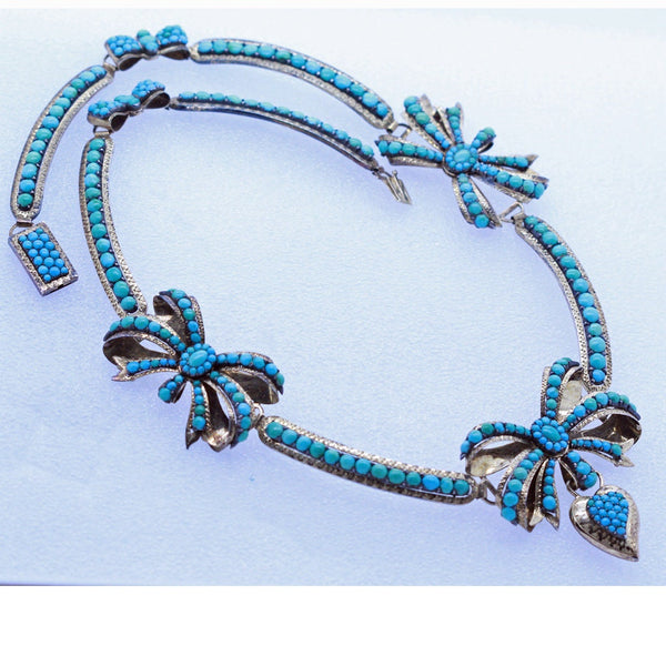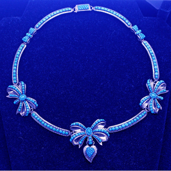 Hearts and ribbons tied in bows were extremely popular during the Victorian era, when romance and sentiment were extremely fashionable. Bows, like hearts, symbolised love, marriage and friendship - the joining together and uniting of two people into one beautiful image. Turquoise had a variety of associations, including enduring love. Hence, in every way, from form to gemstone, the necklace conveys a multitude of meanings as well as the directly obvious quality of its great beauty. The quality of the workmanship is superb - note the fine settings and subtle detail, all showing that no effort was spared in creating this exquisite jewel.