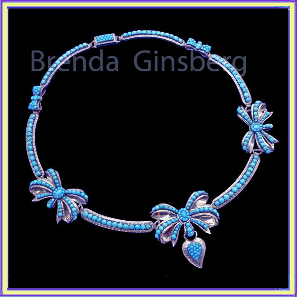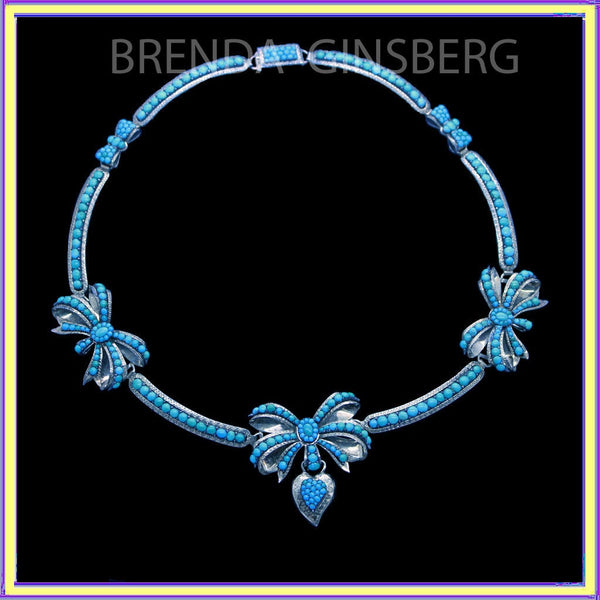 Description : Exquisitely made, romantic necklace. Made of gold and cabochon turquoise. Gently curving long bars, each section pave set with cabochon turquoise. The turquoise rises above a platform of engraved and textured gold. 5 Stations between these bars in the form of bows. The central 3 bows are fully 3-dimentional with ribbon-like loops of gold finely set with cabochon turquoise. The centers are ovals of extremely fine, tightly pave set turquoise with ribbon drops. The outer pair of bows, resembling bowties, identically pave set with turquoise.