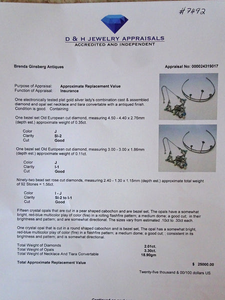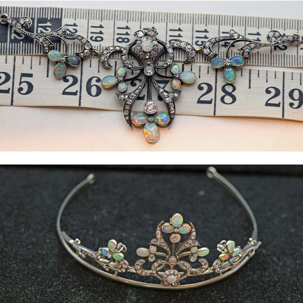 Antique Victorian Art Nouveau tiara necklace. Silver, gold, platinum, diamonds, opals. Made in England late 19th century.