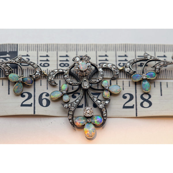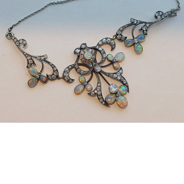 Made during the late Victorian era, this jewel has clear Art Nouveau influence in the swirls and scrolls of the design. The theme of this jewel is floral with scrolls forming foliage set with diamonds, as are 'berries', also set with diamonds. The flowers with 3 petals each are set on fine, knife-edge scrolling 'stalks'. Each petal is set with a pear-shaped opal. Opals display a wide variety of gleaming colors - greens, reds, blues, yellows, orange and violet. The previous owner told me that the lower left opal was replaced, but it looks the same as the others. The diamonds gleam and glisten in silver and lights and the opals do the same in color. Every movement of the head or neck will produce flashing ranges of light and color.