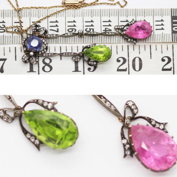 Description: Negligee necklace with drops of varying lengths. A gold chain suspends a lovely bright blue sapphire mounted in a diamond-encrusted fine bow. The ribbon ends of the bow twist and turn naturalistically and suspend a pear-shaped peridot and pink tourmaline respectively. Ends are knotted bows of diamonds. Diamonds are set in silver over gold, which is typical of the Victorian era.