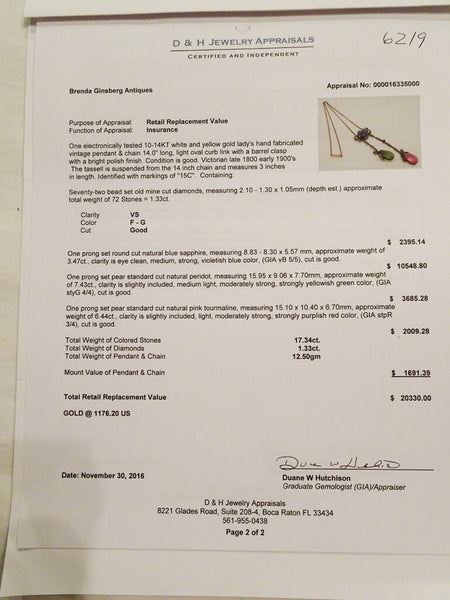 Measurements: Total length 15.5 inches (39cm). Weighs 12.5 grams. Square cut sapphire weighs 4.20ct. Peridot weighs 7.22ct. Tourmaline weighs 6.81ct. Tourmaline and Peridot are antique pear cut. Total diamond weight is 1.0ct.