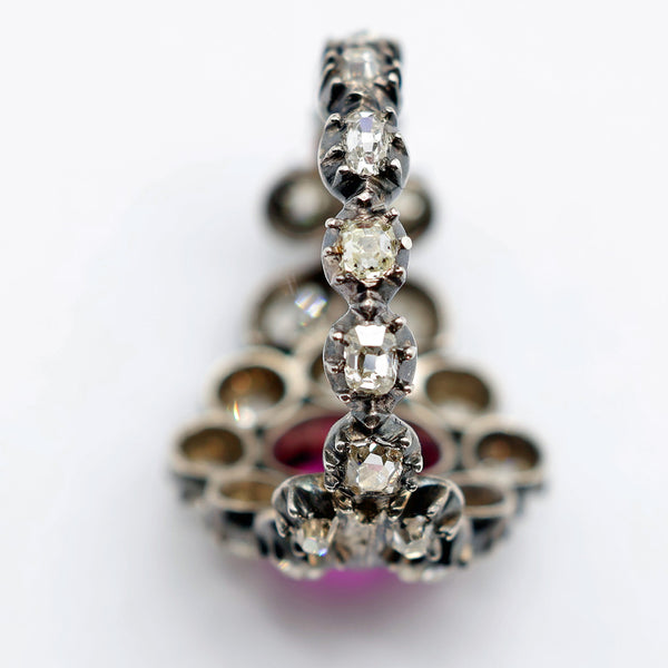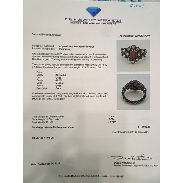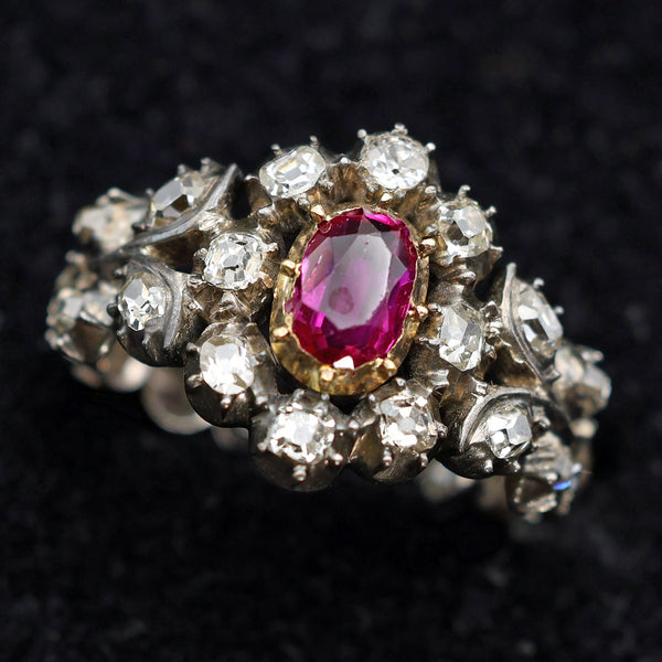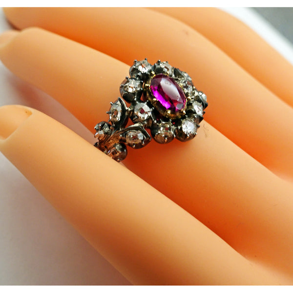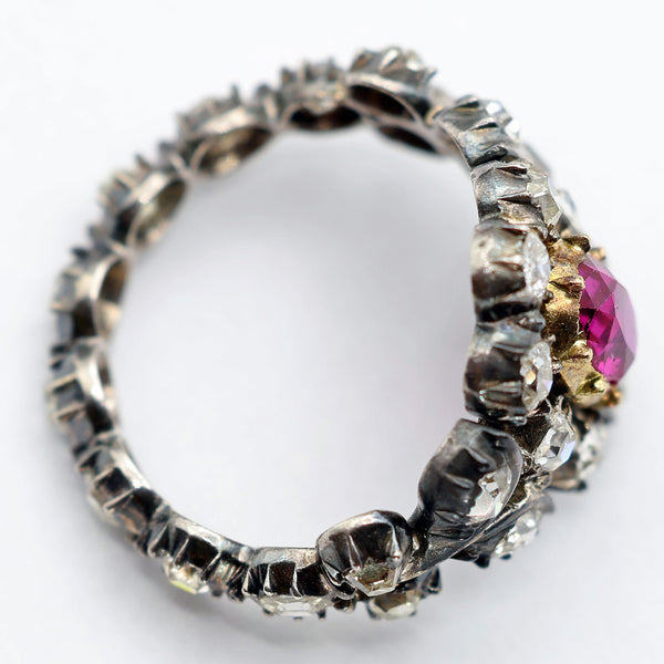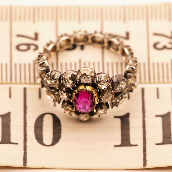 Flower theme with the bezel (top) of the ring formed by a slightly raised oval ruby, like the centre of a flower, held in gold and surrounded by a ring of Old European cut diamonds, set in silver as was the custom in order to show diamonds off to greater effect. The shoulders are 2 pairs of diamonds in leafy form that lead to a continuous line of diamonds that run the entire way around the shank. It is very rare to find rings with diamonds set all the way around the shank.