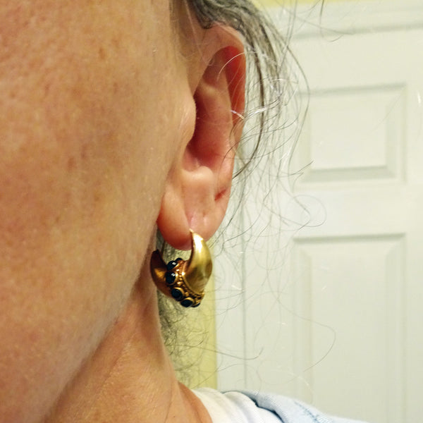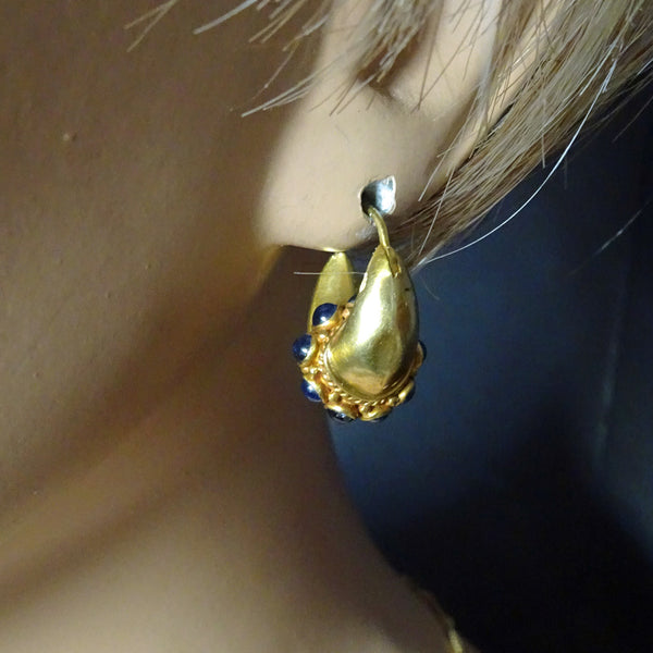 Antique - vintage small ear hoop earrings. Gold and cabochon blue sapphires. Made in India. Exact age is unknown - the same earrings were made for centuries. Believed to date to early 1900's.   Unisex - worn by men and women.