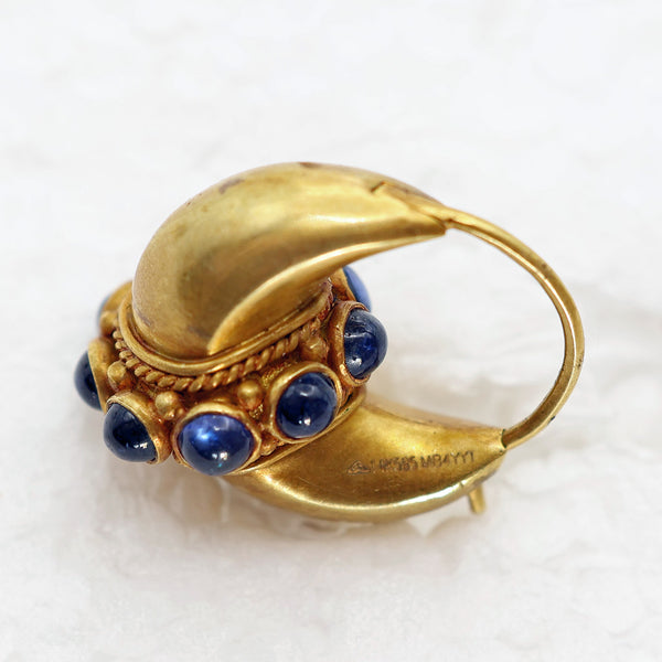 Lunate or crescent moon shaped, tapering towards the tops. The broad, generous cylindrical bottoms are adorned with raised wirework and granulation that runs all the way around / across the hoop and has a ring of colette set cabochon sapphires in its centre. Very good workmanship.