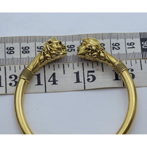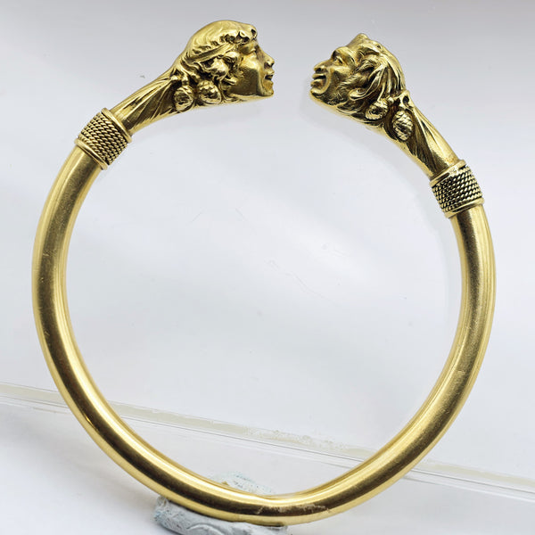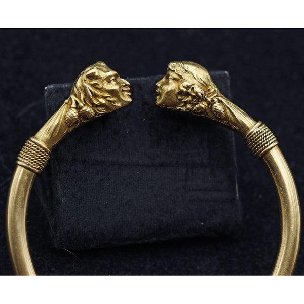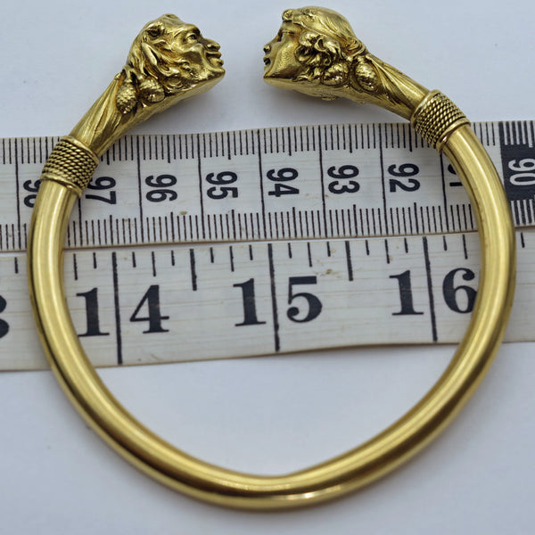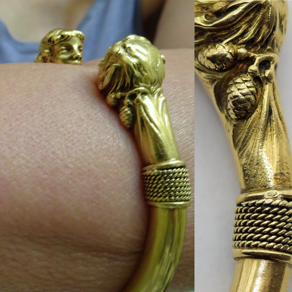 Large, heavy cylindrical gold bangle. Almost a full circle with a gap between the terminals. The terminals and area behind them in the form of a pair of mythological heads - a satyr and a nymph staring into one another's eyes and smiling gleefully. The satyr with full, grinning lips, pointy ears, little horns and engraved hints of a hairy beard. Behind his head, pairs of pine cones. See the story below. The nymph is a beautiful, smiling young girl with wavy hair held by a bandeau. Her hair floats down the back of her head to her neck, surrounded on either side by pairs of pine cones. Open space between the two heads, who are facing one another and both smiling or grinning.