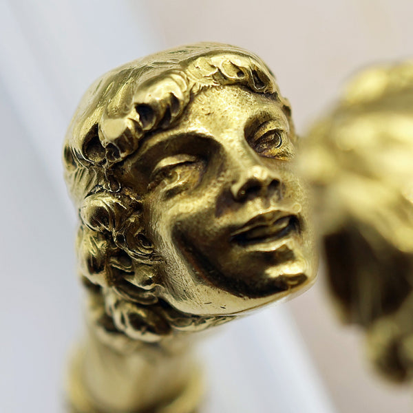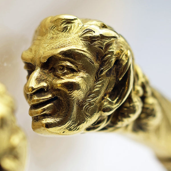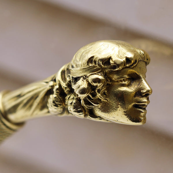 Since the days of Ancient Greece, cylindrical bangles with various heads have been popular and never gone out of style. In India, the same form often depicts crocodiles, elephants or foo dogs. Many cultures have created similar bangles, but the French during the late 19th century excelled in their modelling and originality, creating fantastic heads of varying subjects. While very rare, we have seen these bangles with the heads of animals as well as humans and other forms.