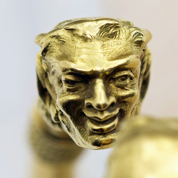 The rope-twist collar behind the satyr has both the French eagle head mark for 18k gold and a slightly worn diamond-shaped lozenge with the hallmark of the Gross & Langoulant Workshop.