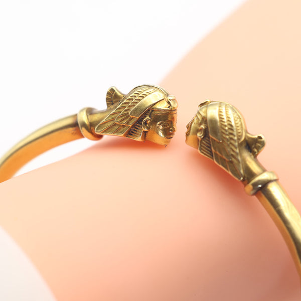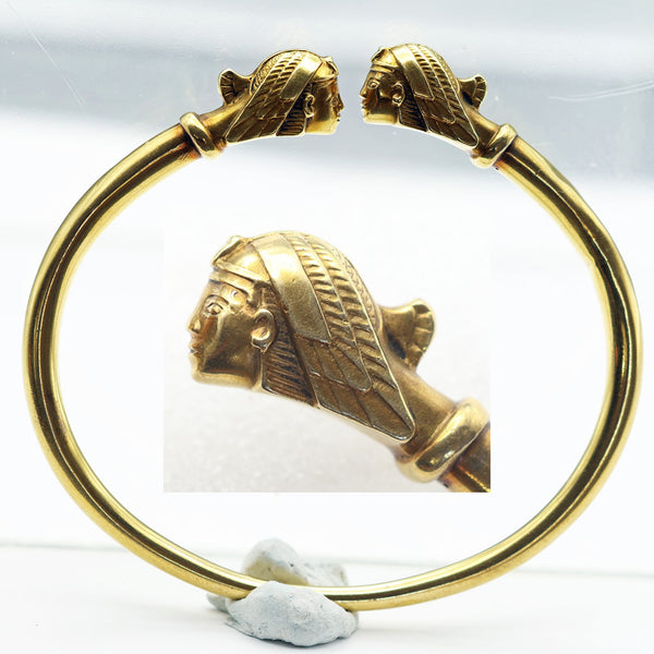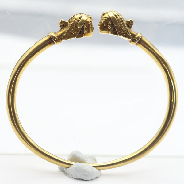 A cylindrical gold bangle with open space between a pair of head terminals.  The heads face one another and are largely seen in profile.  Clearly Ancient Egyptian Pharaohs.
