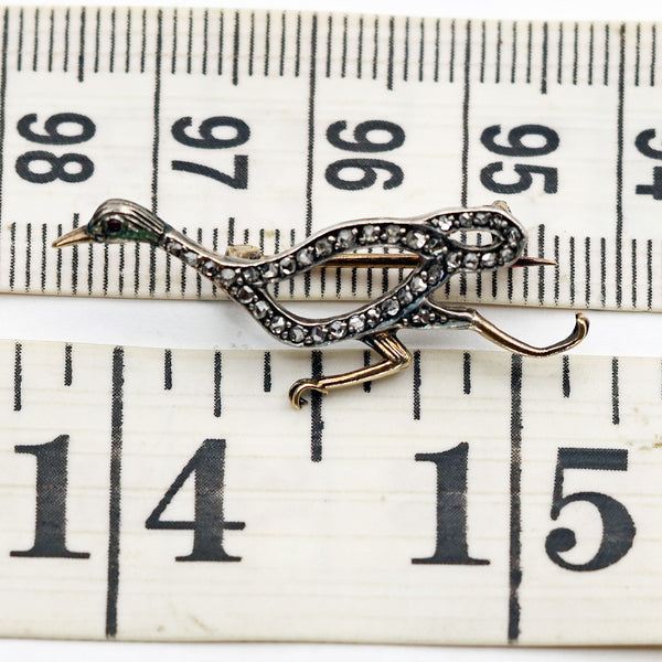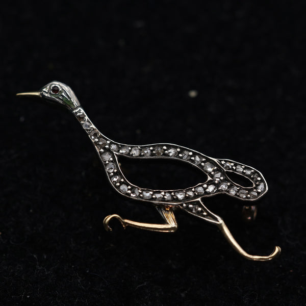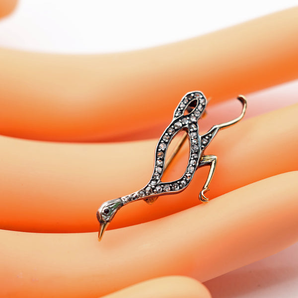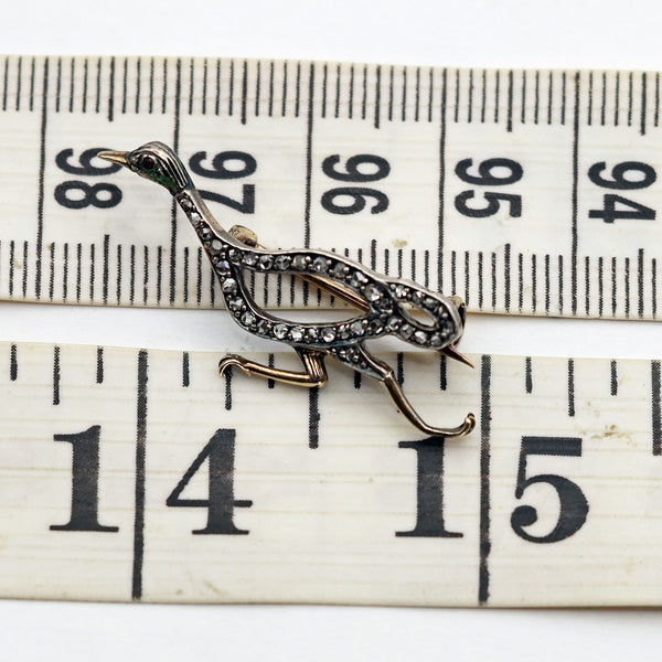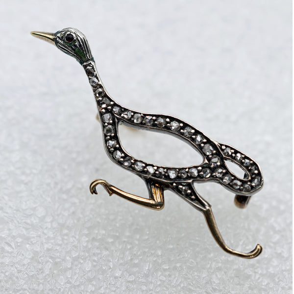 An openwork figure of a running duck, as though drawn in outline with a space between the lines of diamonds. The body, long neck and head are pave set with diamonds. Diamonds are set in silver, which was the custom during the 19th and early 20th century as it showed them off to best effect in candle or gas light. The silver section is laid over a layer of gold in order to protect the clothes from tarnish. The beak and legs are gold.