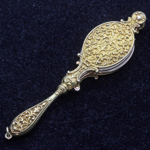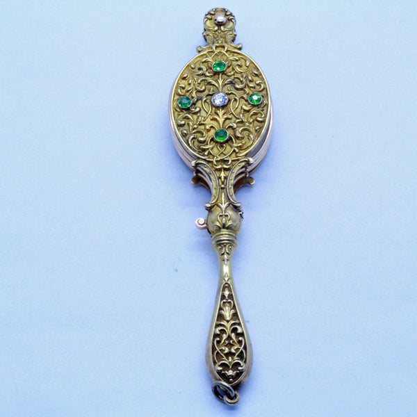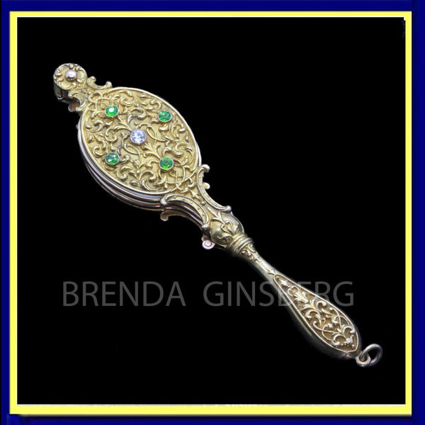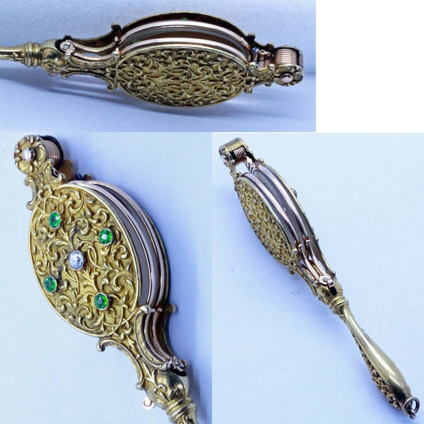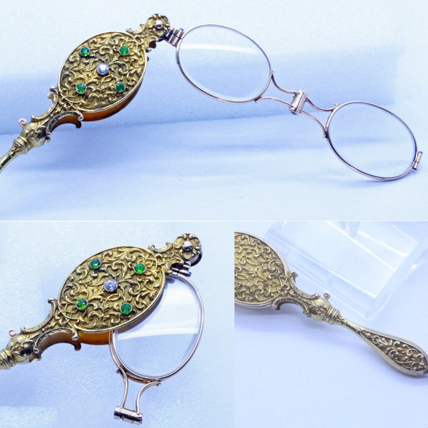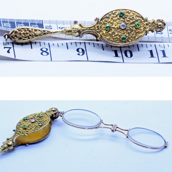 Description : Lorgnette - magnifying glass for seeing details more closely as done during the Art Nouveau era with fabulous style, art and craftsmanship. A luxury item as much for show as a beautiful jewel as it was functional. The lenses are contained in a case with superb repousse gold scrolls and foliage, set with a central diamond and 4 beautiful demantoid garnets. The elongated oval handle ends with a pair of loops, allwing the lorgnette to be worn on a chain or ribbon and thus to be easily available and ready to be used. A gold catch releases the glasses, held by a tight coil and enclosed in gold frames. When open, the two lenses seperate, like a pair of spectacles. One lens folds over the other and they are tucked back inside the case, clicked shut by the same catch. The back of the case is decorated in the same manner as the front, but without the gems.