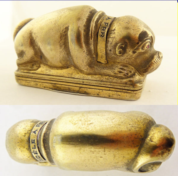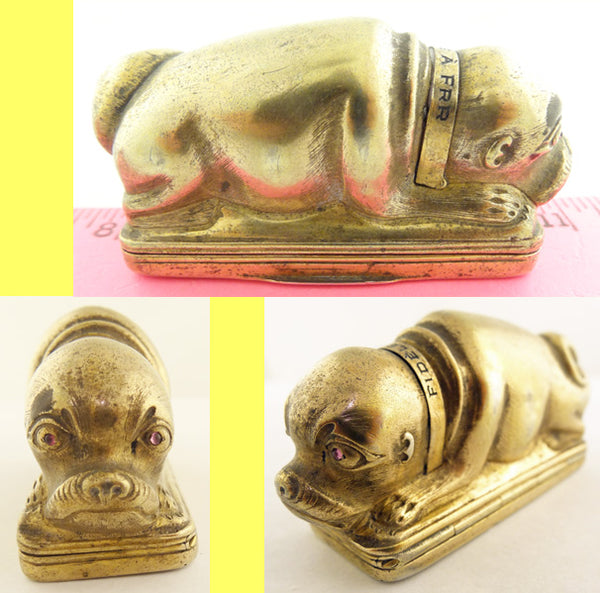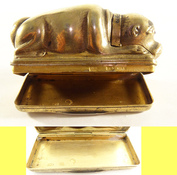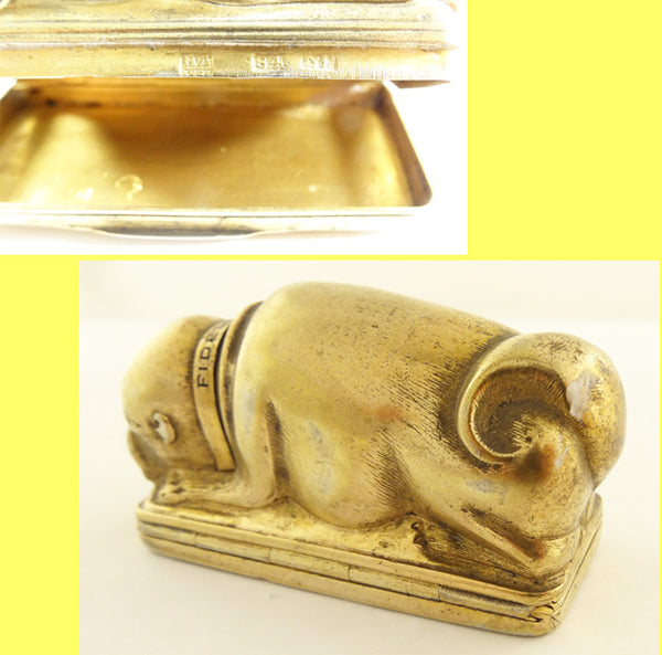 Rectangular tobacco box or tabattiere with a dog modelled on the lid. Full relief shape. Looks like a boxer, bulldog or possibly a pug. Eyes are amethysts. Collar engraved FIDELE A FRR - presumably refers to the loyalty of the dog. Surface is gilt washed. Thumbpiece in front aids opening the box.