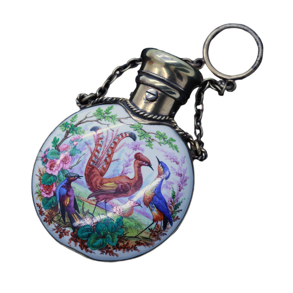 Handpainted enamel metal mounted porcelain perfume / scent bottle chatelaine with chain and finger ring.