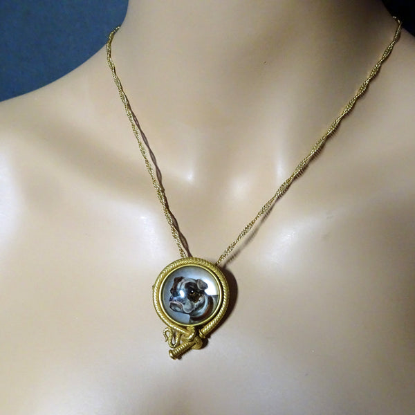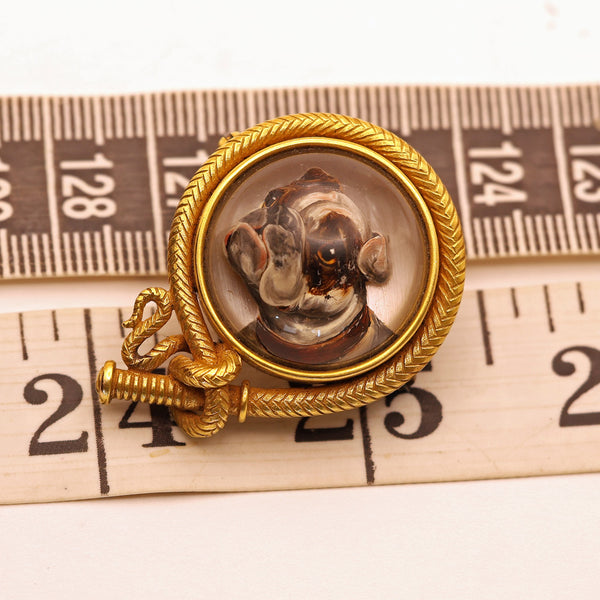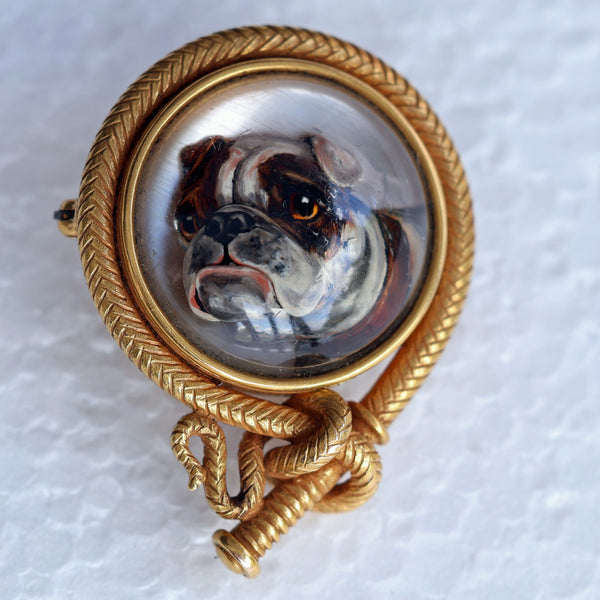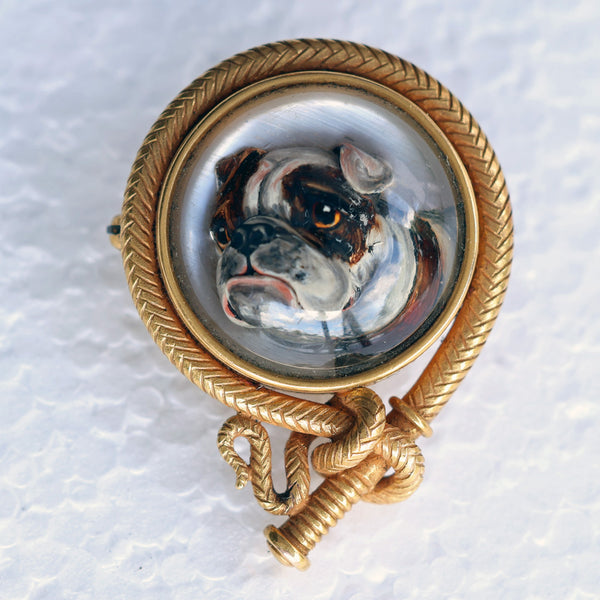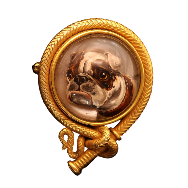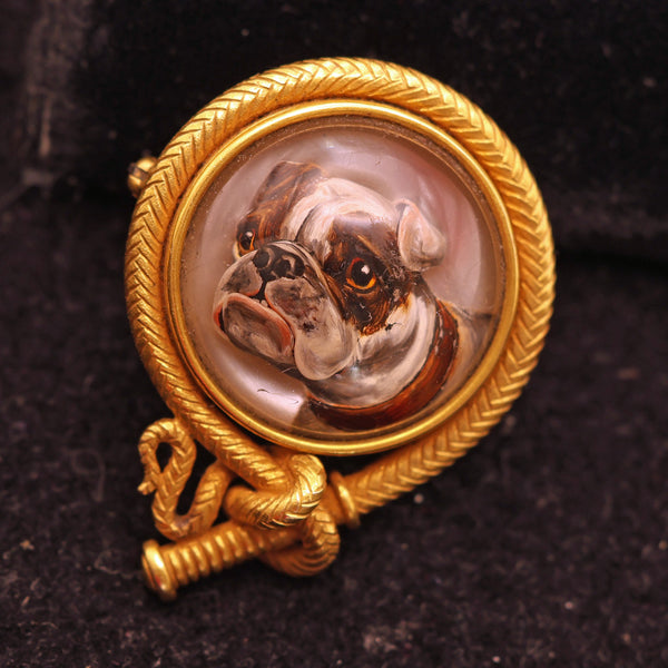 This is an exceptional example, both from a number of perspectives: the size is larger than most Reverse carved crystals; the quality of the carving is superior to most Reverse carved crystals; the mount is fantastic and superior to most Reverse carved crystals. It is versatile - can be worn as both a brooch and a pendant, by man or woman. A must for any dog lover, but especially for the Bulldog fan. And this is a gorgeous bulldog.