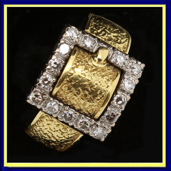Description: Exceptionally well made and luxurious buckle ring. While buckle rings were popular during the Victorian era, this one is clearly a little later. The belt part of the ring (the hoop), is textured gold - possibly imitating leather as it naturalistically arches and curves and appears to pass through the buckle. The buckle is made of white gold to offset the diamonds to greater advantage and contrast with the yellow gold for greater effect. The diamonds are particularly well set and the workmanship in all is especially fine.