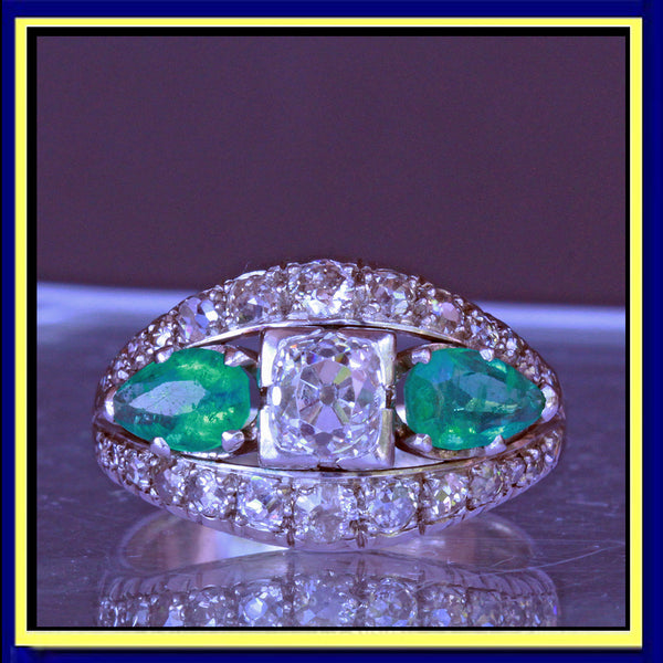 Set in platinum 2 rows of rose-cut diamonds border a line of larger stones: an old mine cut diamond flanked on either side by a pair of emeralds giving the impression of a stylised flower and foliage. The emeralds are pointed pear-shaped and each has a wonderful deep hue and lovely brightness. Below each of the outer bands of diamonds is a gallery of scrolling platinum. This allows light to enter from behind the stones and add to their brightness. It also lifts the diamonds and emeralds above the level of the finger, drawing attention to the higher central line of diamond and emeralds. This ring is very well made and perfect as a wedding or engagement ring. Beautiful design that shows off stones and fingers to best advantage. The ring goes with everything - elegant and attractive.