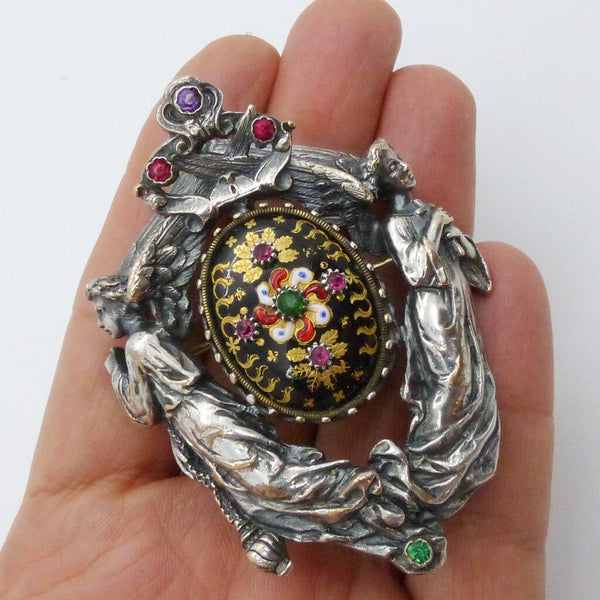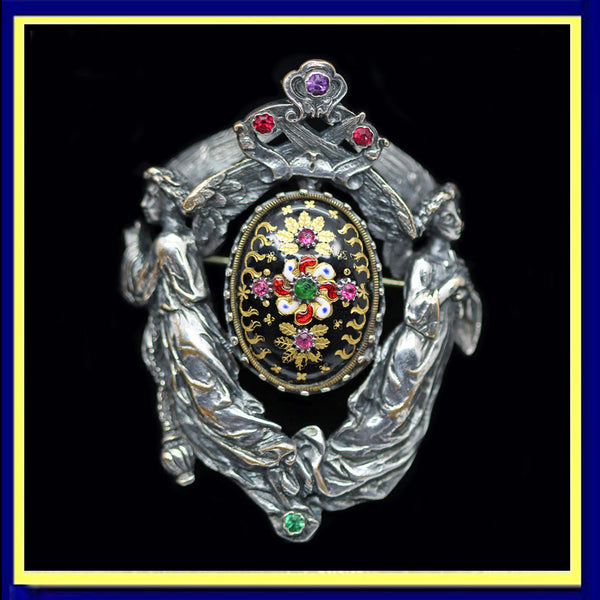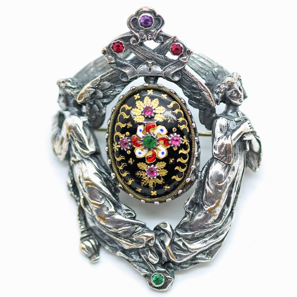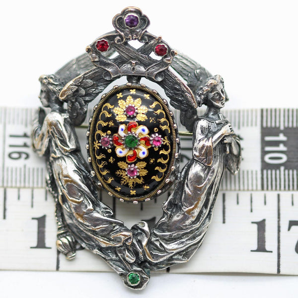 Made in France during the first half of the 19th century. Made largely of silver with hints that parts were once highlighted with gilding. The brooch depicts a pair of angels with upraised wings, one holding a large crucifix, one with a large religious censor hanging from her belt. Gems adorn the bottom and top scrolls of the brooch. We tested the gems and while some are clarly paste, some appear to be natural. This is typrical of French provincial enamel work.
