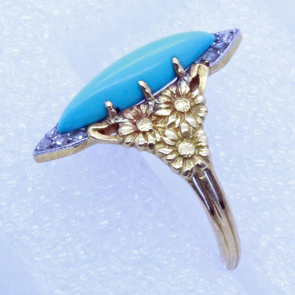 Description : Navette shaped ring - a long oval with pointed ends. Called Marguerite, which means Daisy in French because of the moulded gold daisies on either side of the bezel, running down to form the shoulders of the ring. The two arching bands of daisies hold up a long, navette-shaped turquoise of a lovely uniform color, bordered on either of the long-ends by finely set, small rose-cut diamonds in silver, as was the custom in those days. Contrast the soft glow of the gold to the sheen of the turquoise. The turquoise is allowed to shine and star with the diamonds for once taking the backstage and acting merely to show off the turquoise to best advantage and 'finish' off the ring with a little extra pezazz. A lovely example of rare Art Nouveau jewelry with the elongated, arching shape, the beautifully modelled flowers and fine workmanship. Flowers such as daisies (Margueritte in French) were very popular during the Art Nouveau era. The luscious triangle formed by the flowers ending at the shoulders with a whooping, whiplash loop of gold, are almost a signature for the Art Nouveau style and period. Typically French attention to detail such as the gentle curve of the bezel that wraps around the finger, adding elegance and beauty.