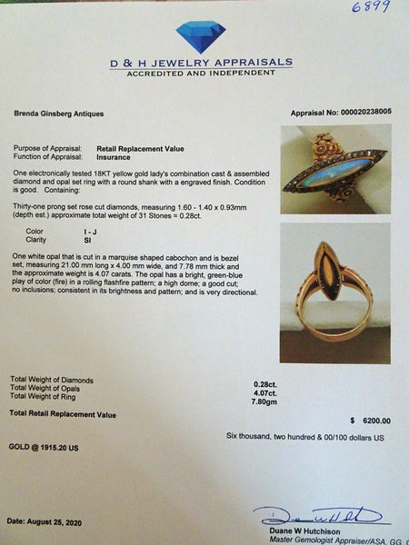 Description :Spectacular looking Art Nouveau ring. Very strong design with an elongated, narrow navette-shaped opal raised up in the center, held in a gold colette and surrounded by a lower border of rose cut diamonds set in platinum. The opal is fabulous - various shades of blue and purple, glowing orange and light as the finger moves. Full of life and movement. Cut en cabochon, the opal is almost like a torpedo in its length and powerful long, rounded shape. The wide shank is no less fabulous with wonderful repousse gold flowers in high relief near the shoulders and foliage as the shank tapers slightly towards the back. This beautiful gold work makes the perfect foil for the strong geometric shape of the bezel and the great play of colors of the entire ring.