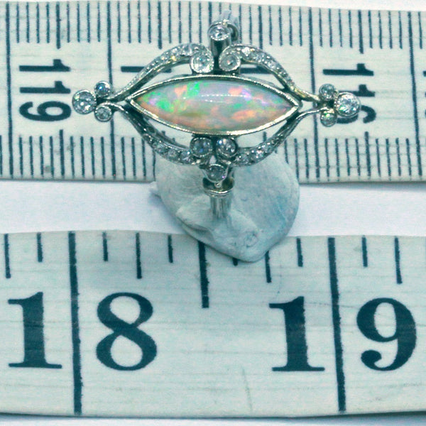 Description : Long and elegant ring. French jewellers during the Nouveau period were especially fond of using navette-shaped opals. This is a great example of a fabulous opal. The colors flash across the spectrum in blocks of red and green on a ground of blue and violet with large areas of orange, depending on the light and how it catches the opal. Full of fire and light. Surrounding the opal is an openwork scrolling design with larger diamonds at the terminals and pave set rose cuts within the filigree mount. The ring floats on the finger. Feminine, enhancing, flattering, this ring is a gorgeous adornment and will look as good on your finger as it did on an early predecessor, almost 150 years ago.