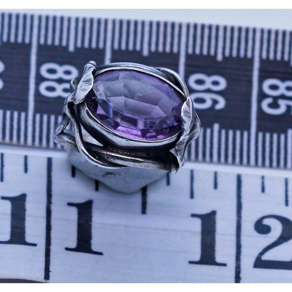 Description : Rare Art Nouveau ring, actually from the period. A large, oval amethyst is held within the fluted, fan-shaped leaves, sometimes referred to as waterlilies and sometimes as ginkgo leaves. The leaves are modelled very naturalistically, as though either floating in water or billowing in the wind and their moving shape holds the amethyst in place, very cleverly. The stems form an openwork, overlapping, twining structure that surrounds the amethyst, incorporating the shank of the ring in their design. This is a rare example of genuine Art Nouveau jewelry, incorporating the design and aesthetic of the period and style. The ring has been resized.