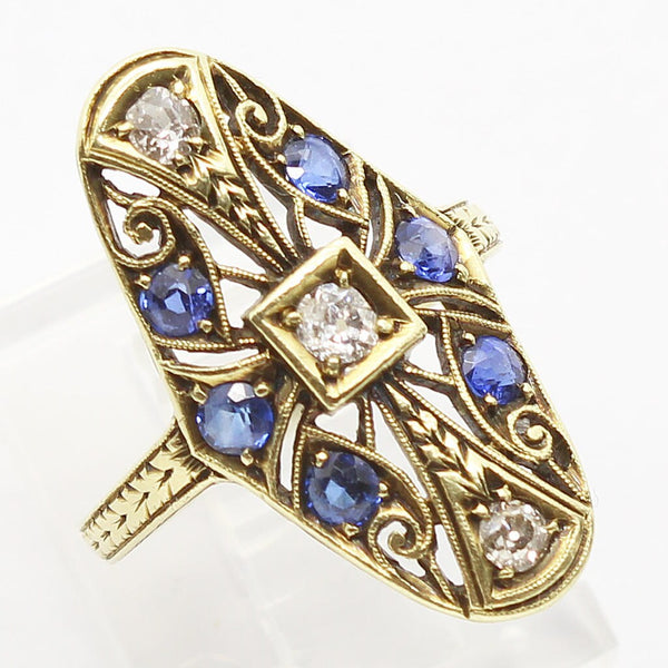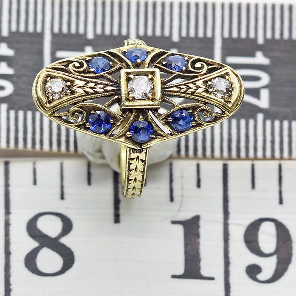 Antique Arts and Crafts / Art Nouveau ring. 14k yellow gold, sapphires, diamonds. Made circa 1880 - 1900 during the late Victorian period.