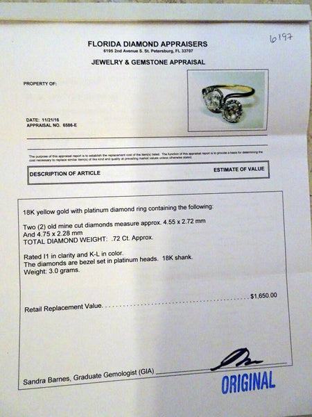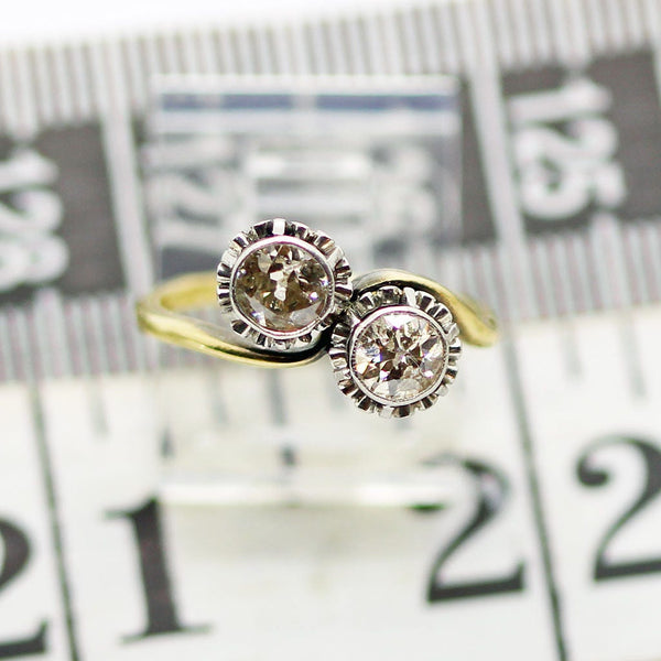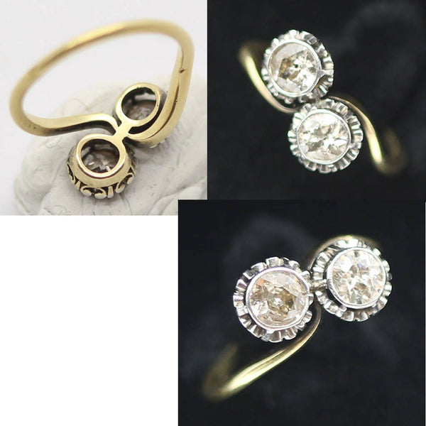 Description: Gold mounting with diamonds held within platinum tops to show them off without reflecting yellow. Platinum openwork scrolls form little hearts in a gallery that raises the diamonds up above the level of the finger and allows light to enter from all sides. The two diamonds are set diagonally on the finger in typical crossover fashion, called toi moi in France. You and I - a nice echo of the romance of an engagement ring. The ring can be worn alone or stacked with other rings.
