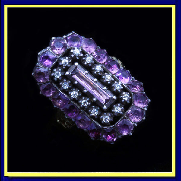 Rounded rectangular, arching shape. Beautiful deep purple, amethyst-colored paste gems, tightly set, form the outer border of the bezel. A second ring of diamond-like paste forms a 2nd border, with light around it on both sides. Within, is a central long, rectangular purple paste. All 'gems' are foil backed and set in silver, typical of the Georgian period. The shank is in scrolling openwork gold.