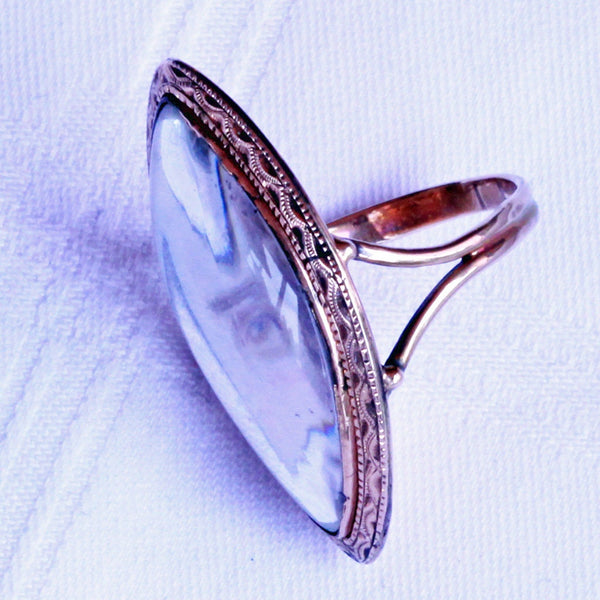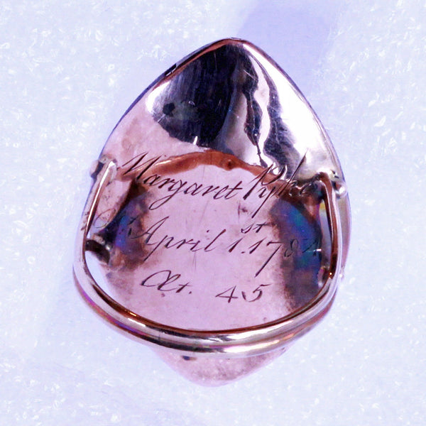 Navette shaped ring in rose gold. The double ridged shank with a wide fork at the shoulders, leading to the gold mount. Gently arched back. Gold, navette-shaped border with bright cut engraved decoration in concetric rings. Within is a particularly lovely miniature eye portrait. The blond/light brown curls and blushed cheek are clearly those of a young lady. Golden eye or iris. The navette shape is particularly well suited to this form of portrait. The gold engraving is of a beautiful, high standard. Large and clear, it makes a great ring that could be worn by a man or a woman. In fact, it was probably given to a man at the time. The ring would have been made during the youth of the young lady whose eye is portrayed. After her death it was engraved on the back: Margaret Pyke 06 April 1784 Ot 45.