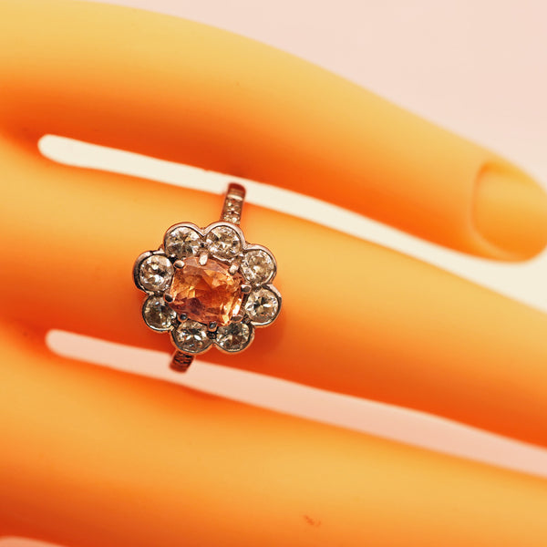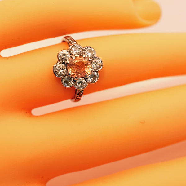 A classic flower-formed ring (Marguerite as the French call it), with scalloped perimeter in white platinum, miligrained finish, each petal containing an old cut diamond. Rising in the center, held in prongs is a very rare orange-pink sapphire.