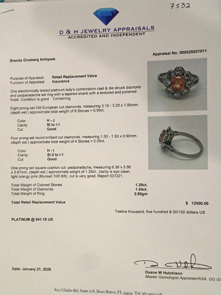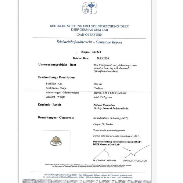 Gemological certificate confirming that the central cushion shaped, step cut sapphire is Natural Padparadscha of Sri Lanka origin, measuring 6.36 X 5.56 X 4.28mm. No indications of heating.