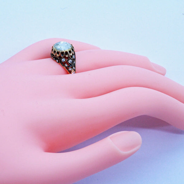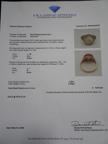 Measurements: Weight is 6.20 grams. Central rose cut diamond approximately 2.10ct. Total diamond weight approximately 2.48ct. US size approximately 6 3/4.