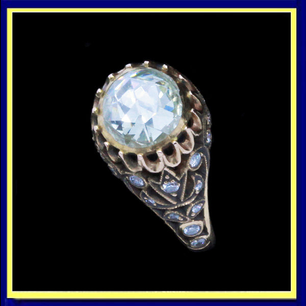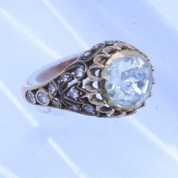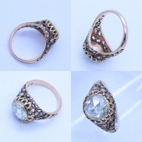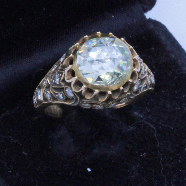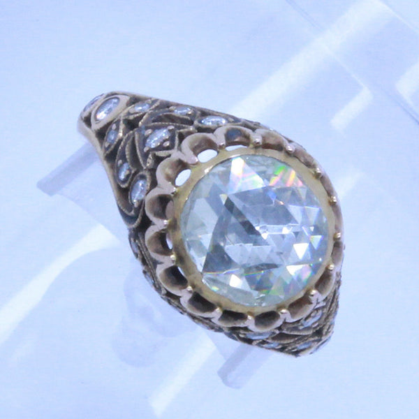 Description : Large central rose cut diamond held aloft in a raised round bezel with a scalloped U-shaped gallery. Below is an openwork scrolling filigree support that extends to the shoulders with stylised flowers and foliage, highlighted with small round cut diamonds. The diamonds extend well down the sides of the hoop/shank. Perfect as an engagement ring or simply to make a great statement.