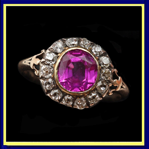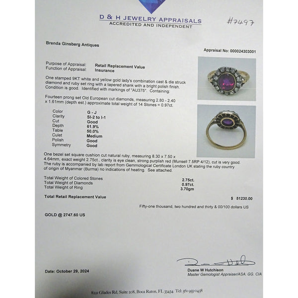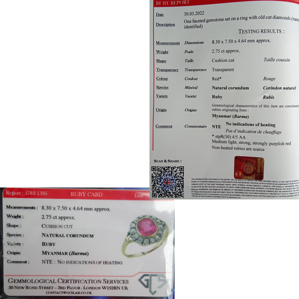 Comes with Gemmological Certification Services London UK certificate stating that diamonds are old cut and ruby measures 8.30 X 7.50 X 4.64 mm 2.75ct, cushion cut, transparent red natural corundum Ruby Myanmar (Burma) Origin and No indications of heating. Additional independent appraisal available to new owner states diamonds are 0.97ct.