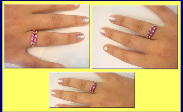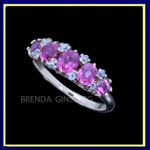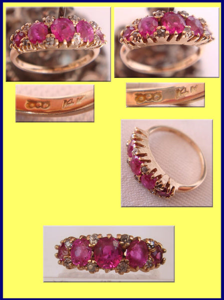 Classic Victorian ring with a row of natural, beautiful pink rubies, each bordered on both sides with a small diamond. 5 rubies and 8 diamonds. The rubies total at least 1 carat.