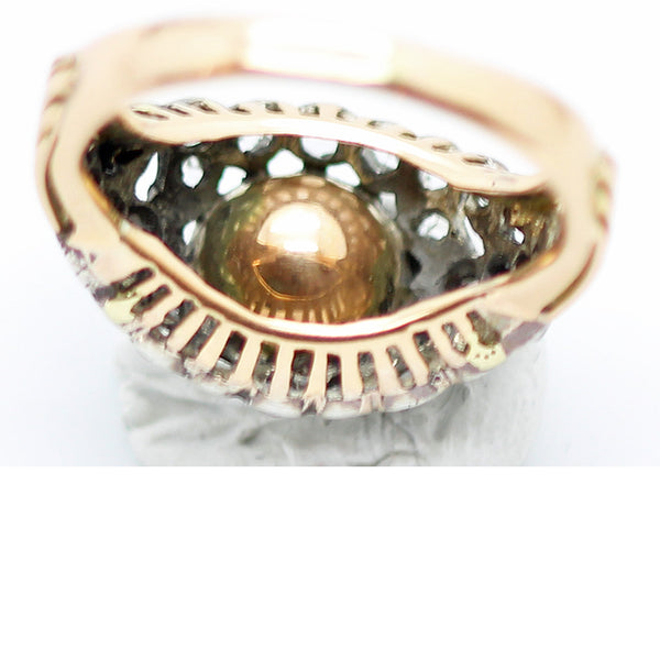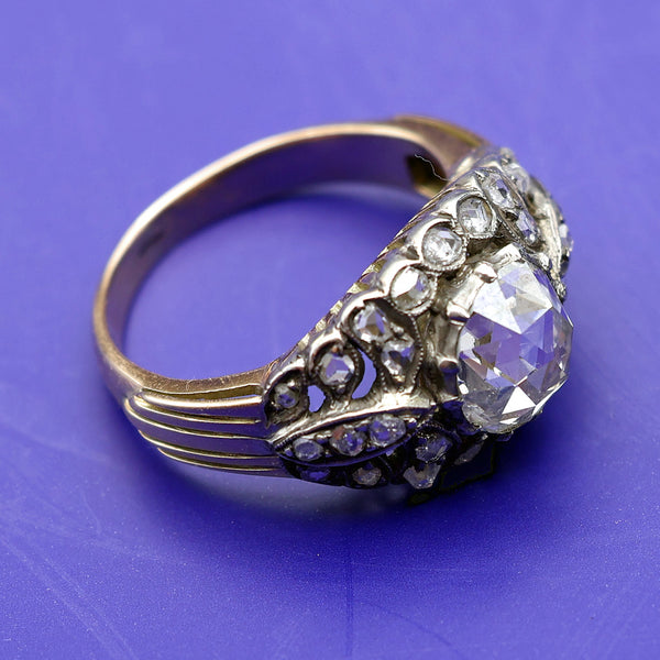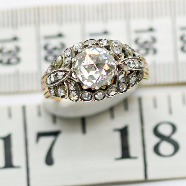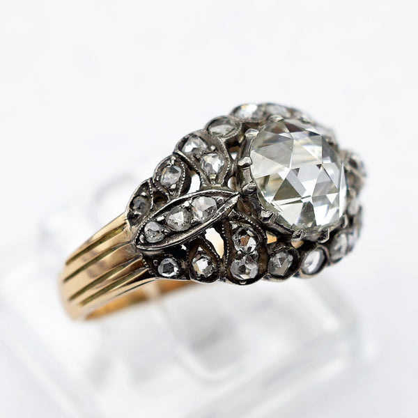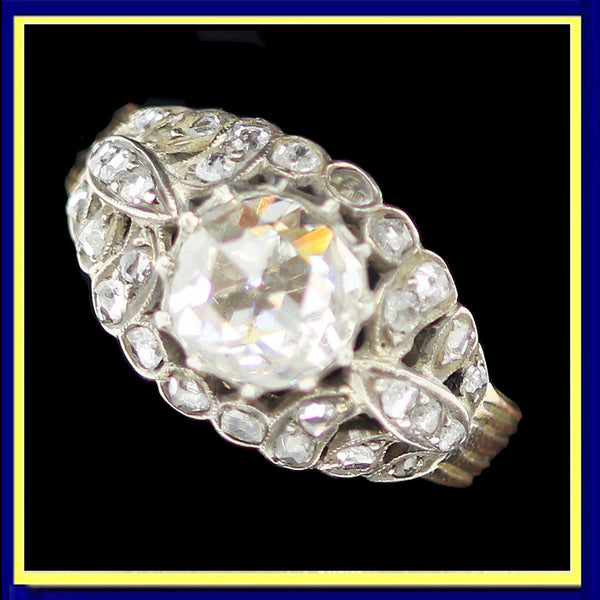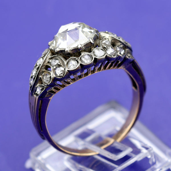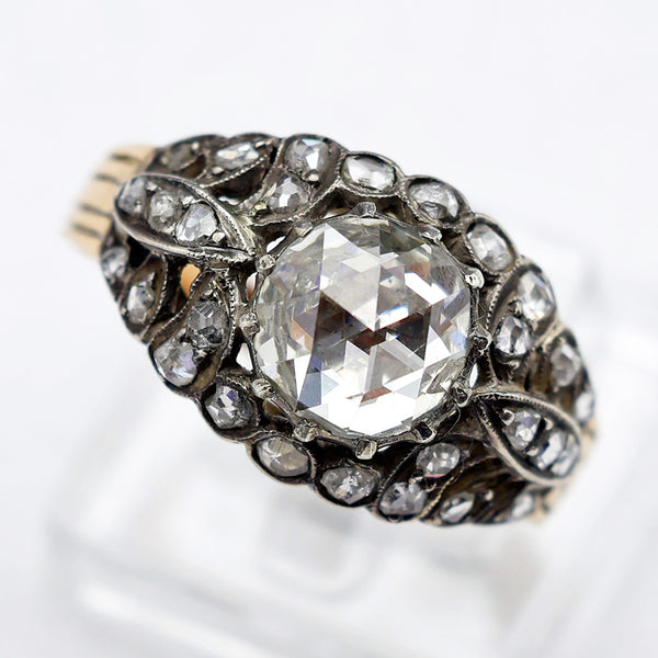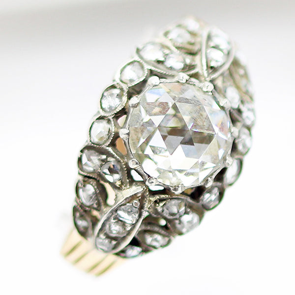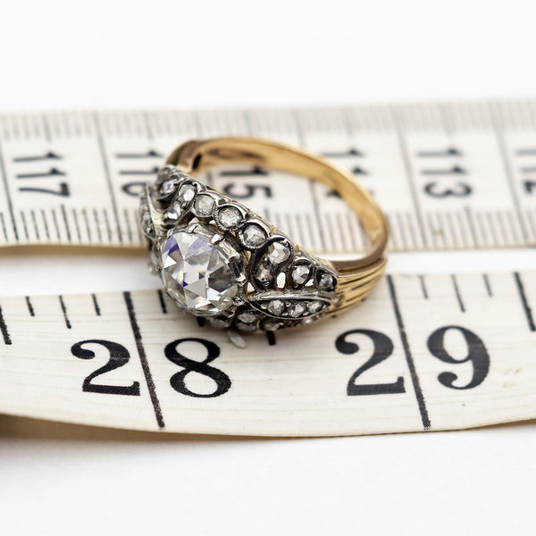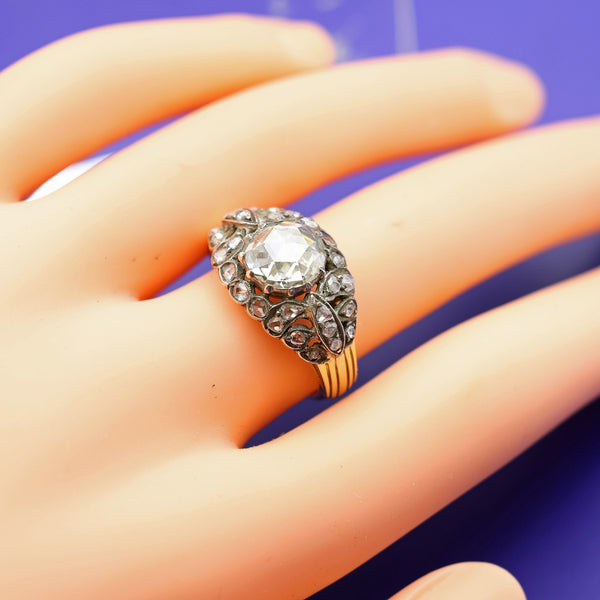 Description: Fabulous setting. A large central rose cut diamond forms the apex of an arching navette shaped bezel. It is surrounded by smaller rose cuts, each in it's own little filigree mount with spaces between them. Very delicate and pretty, yet sturdily made and strong design. Like almost all Victorian jewelry, diamonds are set in silver over gold in order to show them off to greatest advantage. The band is gold with fluted chevrons from the shoulders down the sides. Very sturdy and secure. Within the ring (as seen from the back), is a gold domed reinforcement to support the large diamond in the center of the ring. Makes a fabulous engagement or wedding ring.