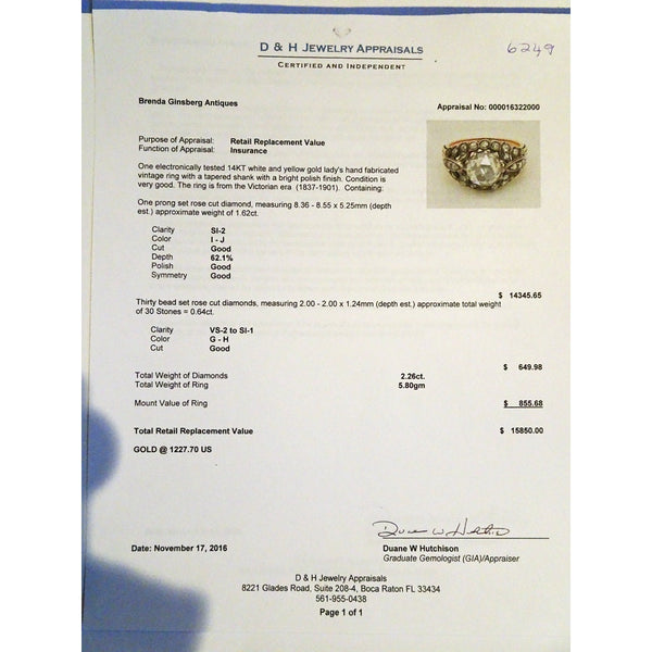 Measurements: US size 7.5 (can easily be resized). Weighs 5.8 grams. Central diamond is approximately 1.62ct. Another 0.64ct diamonds, making a total of 2.26ct diamonds.