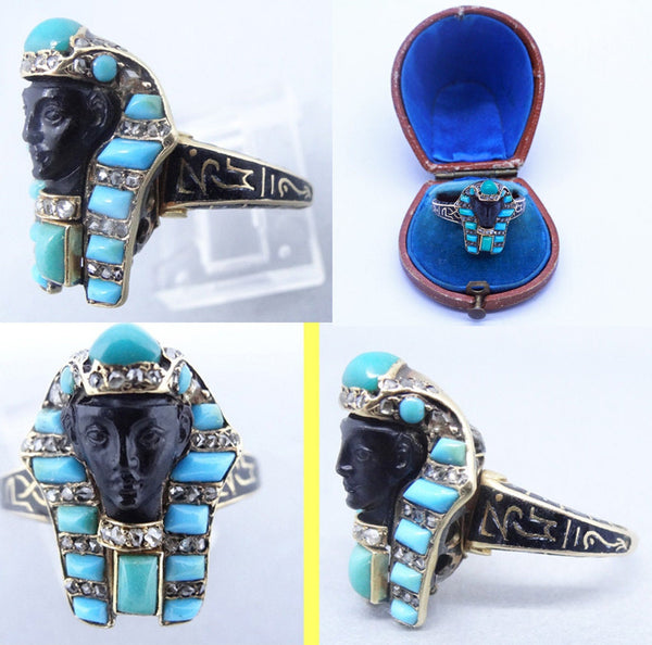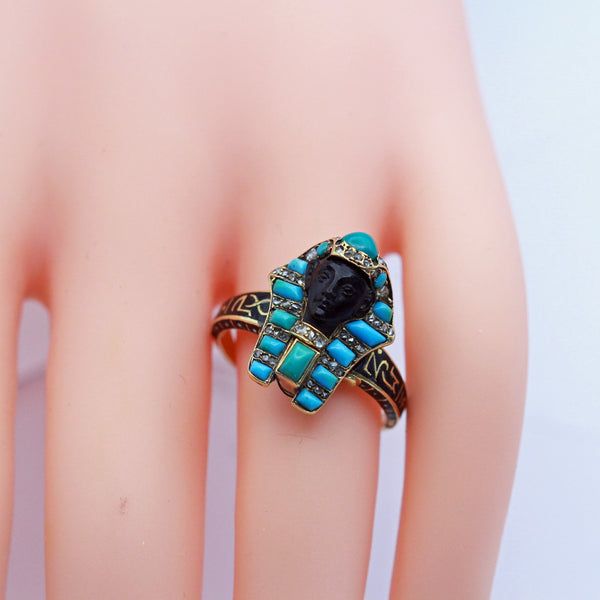 Figural ring in the form of a Pharaoh or sphynx. The face is carved in black onyx with perfect pharaonic features. The marvellous headdress of diamonds and turquoise set in 18k yellow gold. Turquoise was almost a holy gem for the Ancient Egyptians and the combination and contrast of turquoise, gold and black is very striking. The use of diamonds to enhance and outline sections of the headress is purely 19th century as the Ancient Egyptians did not have or use diamonds. The shoulders of the shank are enamelled in black on 3 sides with hieroglyphic like stymbols in gold.