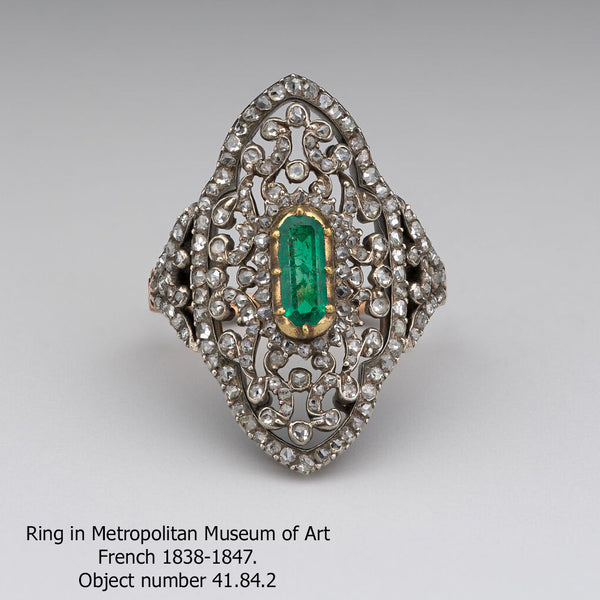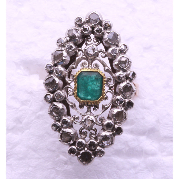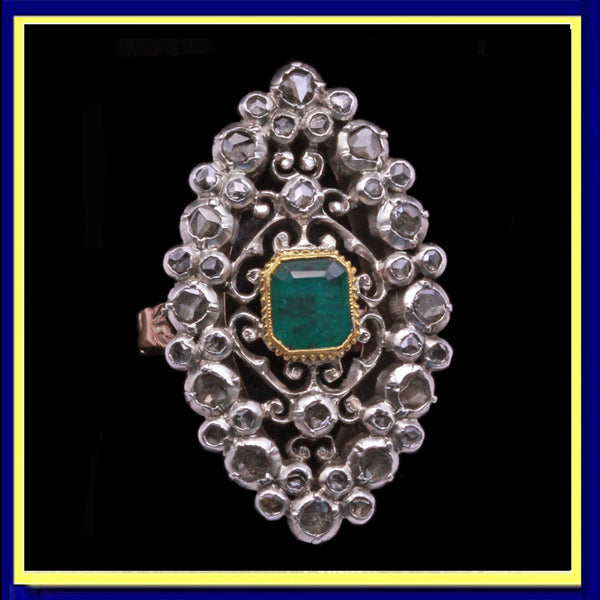 Description : A large ring. Navette or boat shaped ring which was very popular during the late Victorian era. A central, rectangular cut emerald set in a gold bezel that shows off the color of the emerald to great effect. The gold mount with minute granulation or beadwork on the edge. It is surrounded by scrolling openwork in silver with a pair of rose cut diamonds near the long ends of the navette. The border is a lovely design of bezel set diamonds raised above the level of the scrolling openwork within: one bigger diamond alternating with a pair of smaller ones. This adds to the lightness and snowflake like appearance of the diamonds. Since every diamond catches the light at a different time and angle, there is constant flashing of movement to the eye. Like most Victorian jewelry, the diamonds are set in silver over gold. This was to show them off to better effect in candle or gas light.